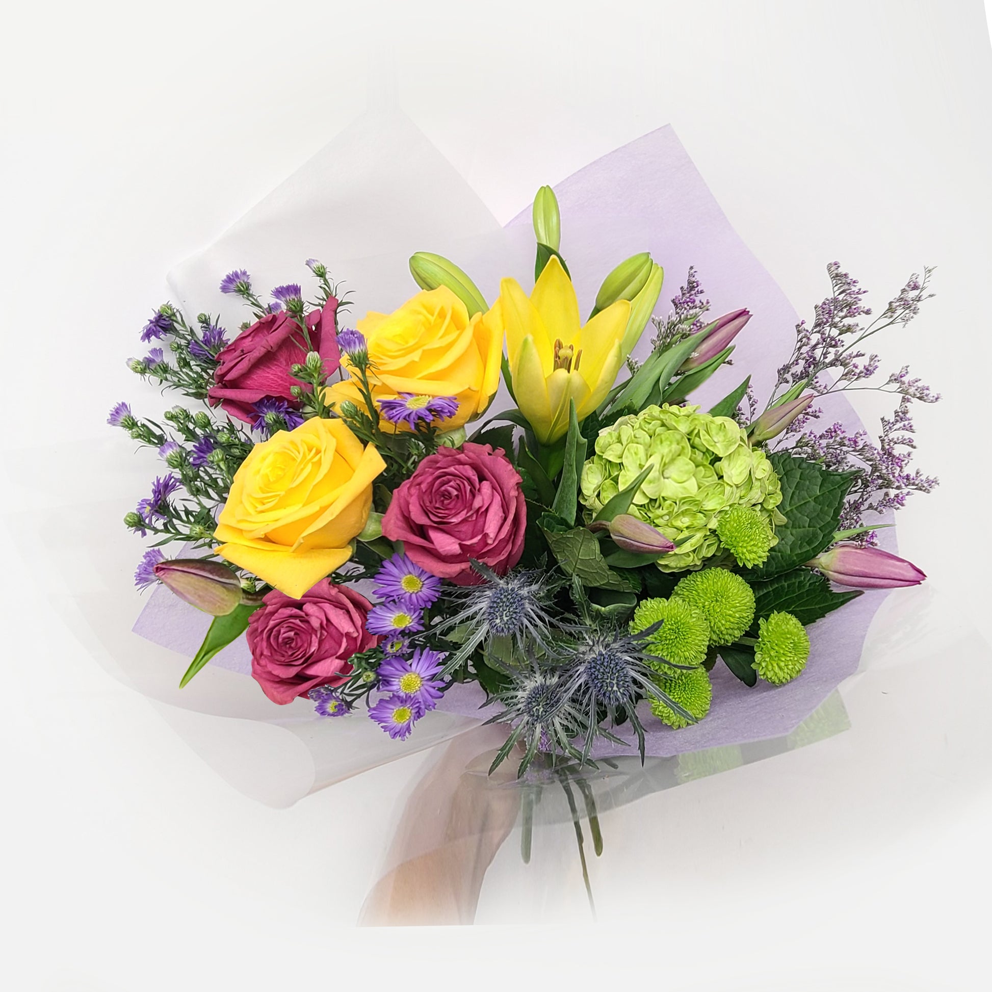 2 roses jaunes, 3 roses violettes, hortensia, lys, Eringium, Alstromeria, 5 tulipes, Caspia et feuilles.
