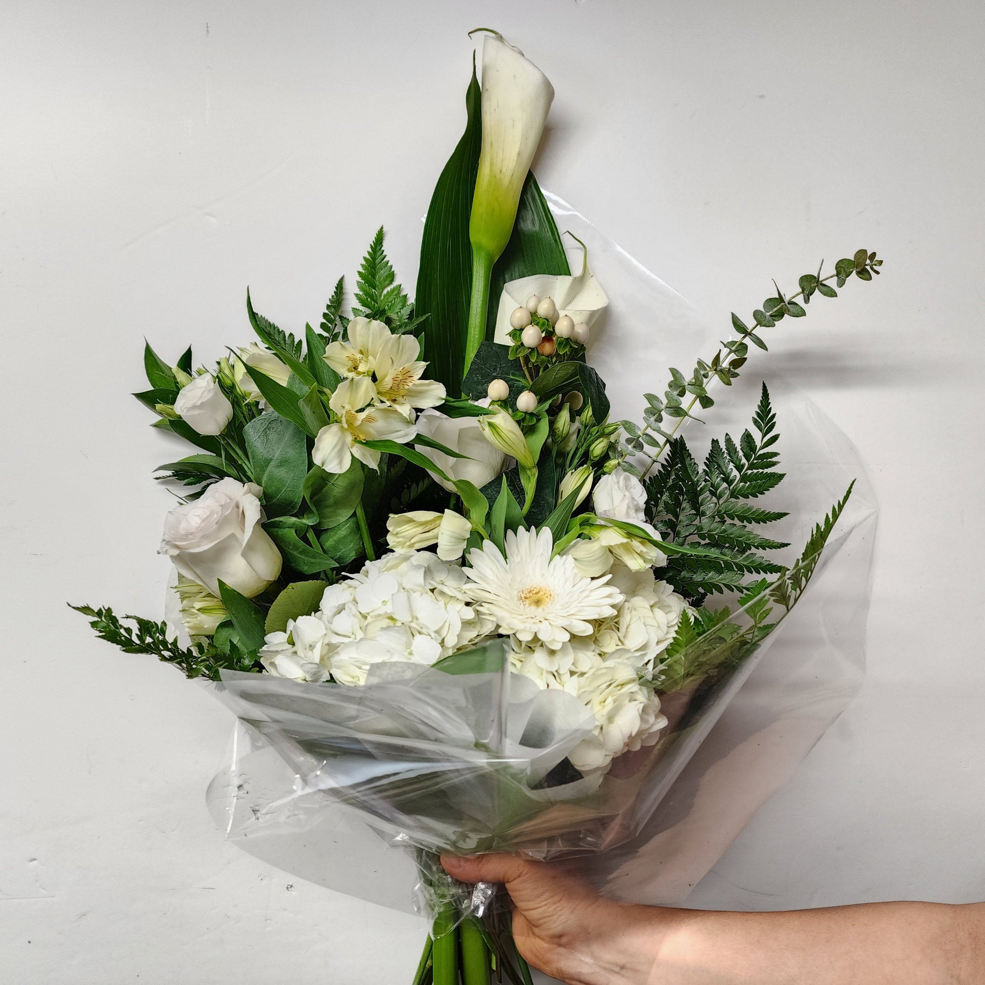 Calla Lily, Gerbera, Hortensia, Roses. Lisianthus, Alstroemeria, Baies d'Hypericum, Eucalyptus, Feuilles de cuir, Aspidistra.