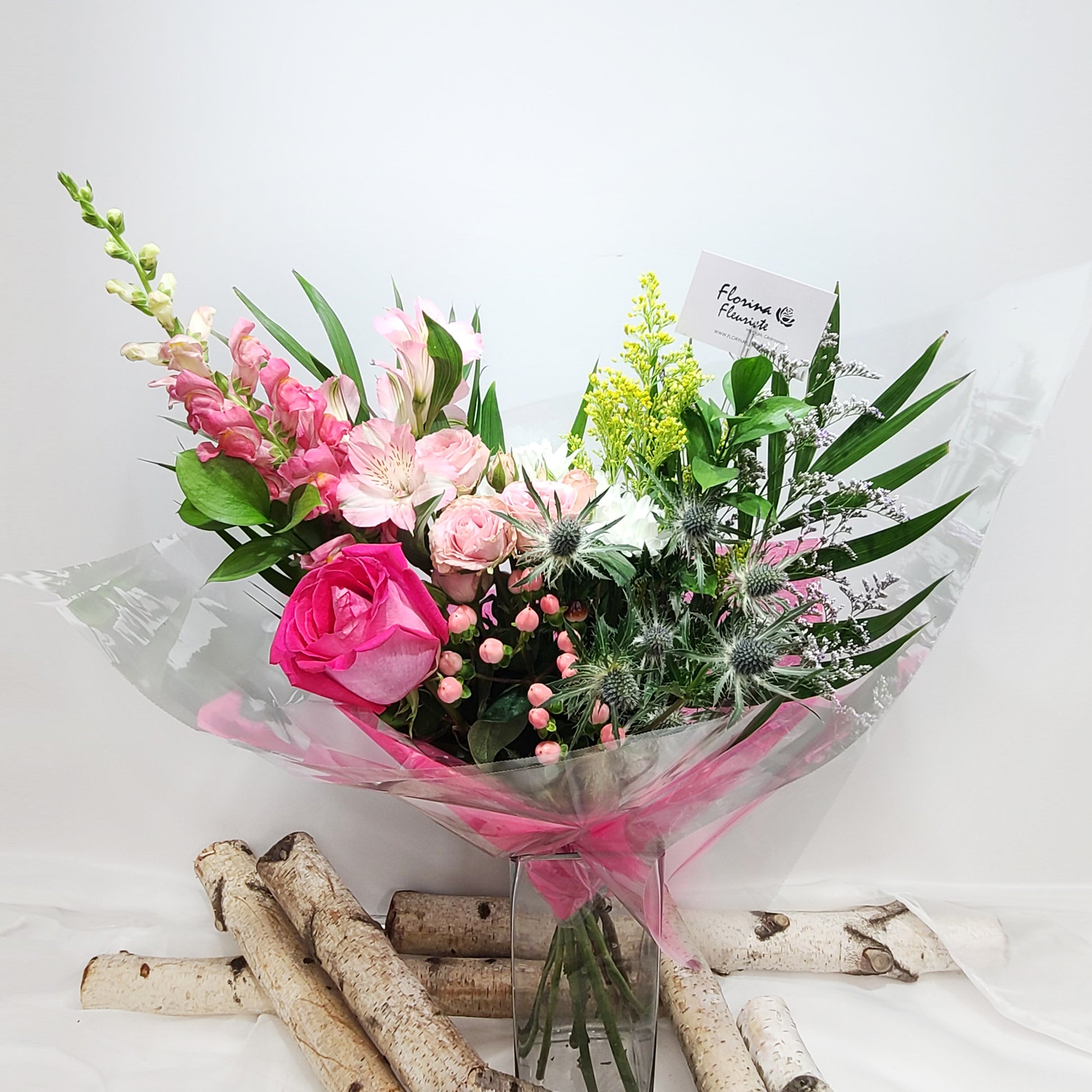 Rose, Lys Calla, Hortensia, Fleur de Cire, Muflier, Solidago, Alstroemeria, Corraline et feuillage.