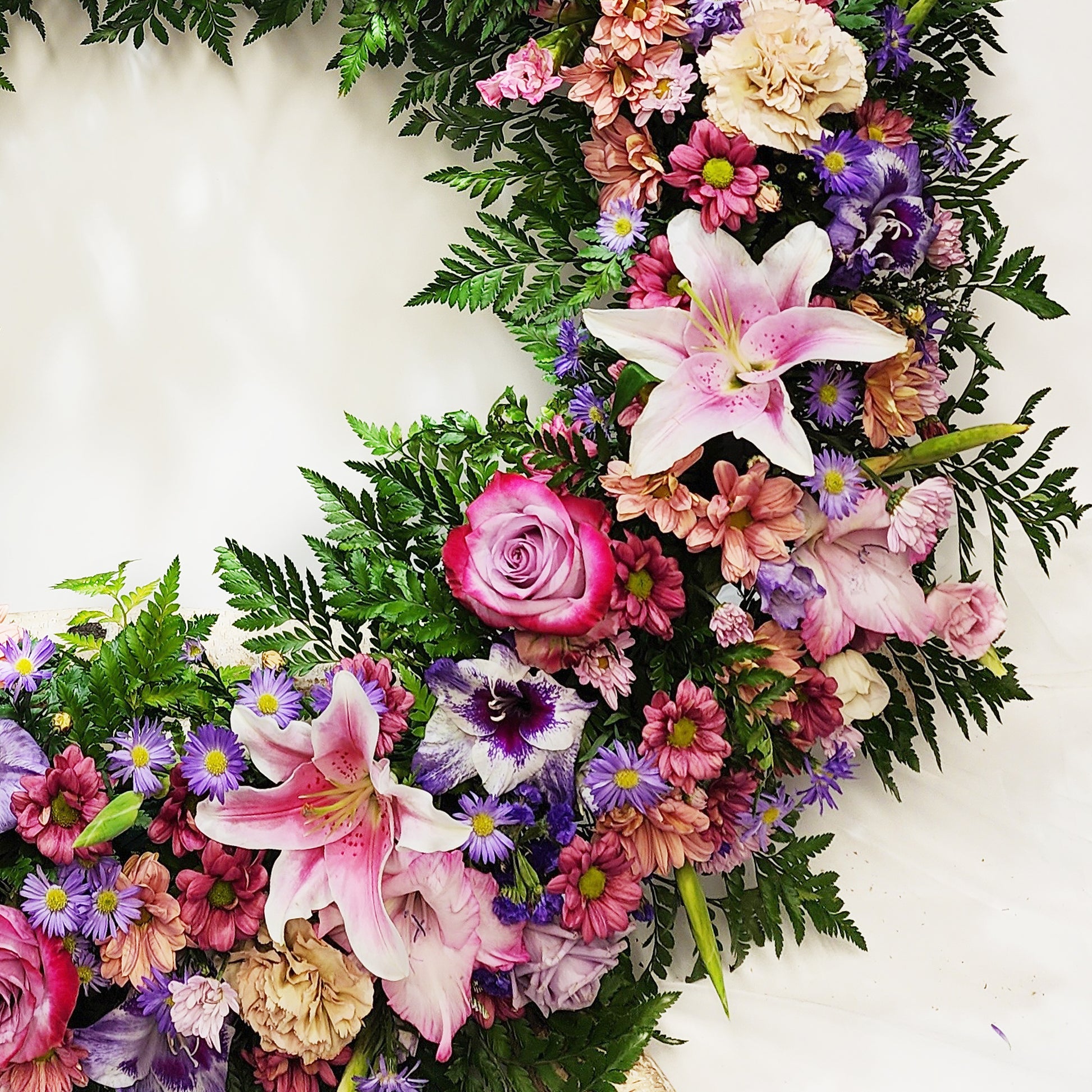 Roses violettes, Lys rose, Marguerite, Oeillets, Alstroemeria, Lysianthus et Polyegos, Corralines et Feuilles.