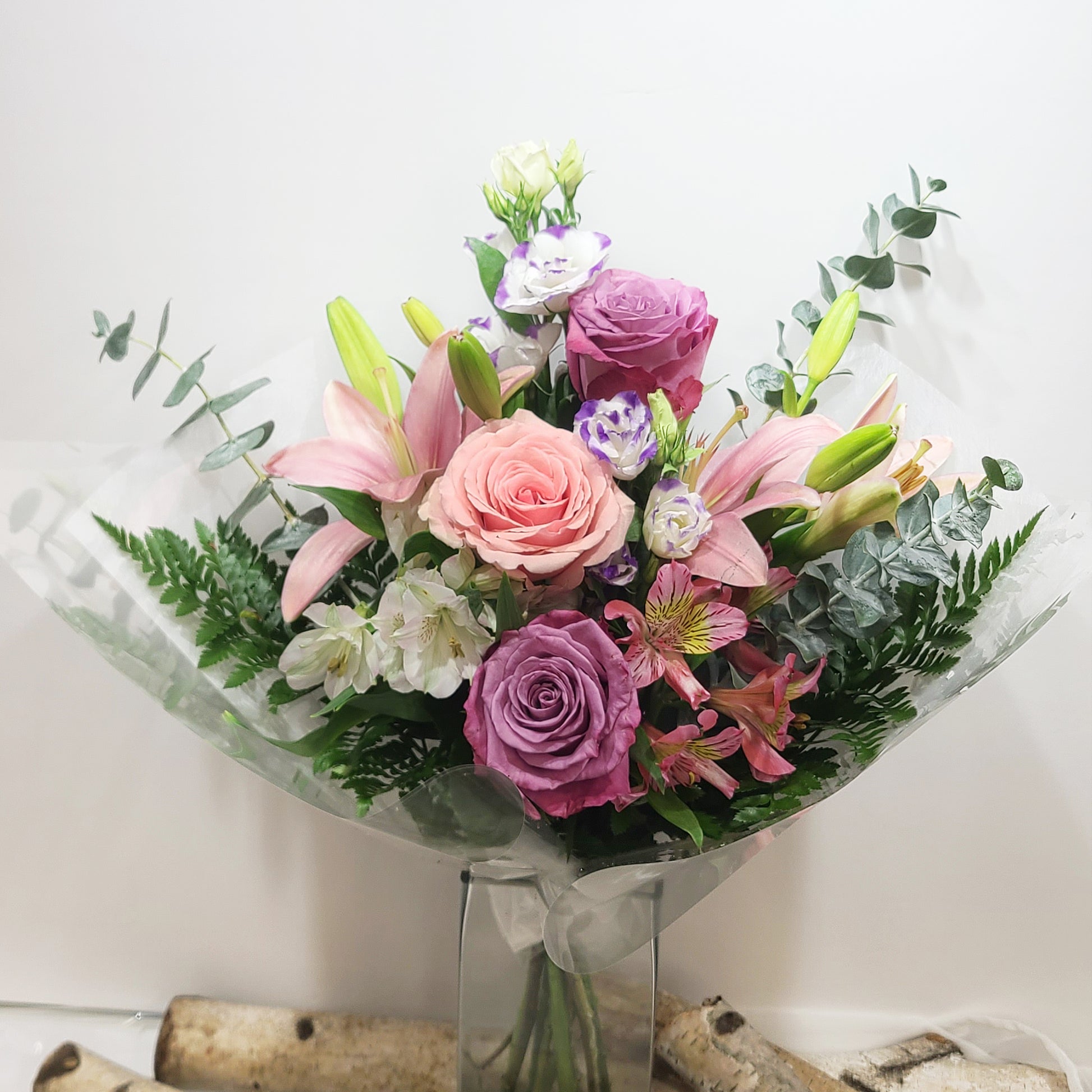 3 Pink Rose , Alstromeria , Lisianthus , Eucalyptus , Lily , Corraline and foliage.