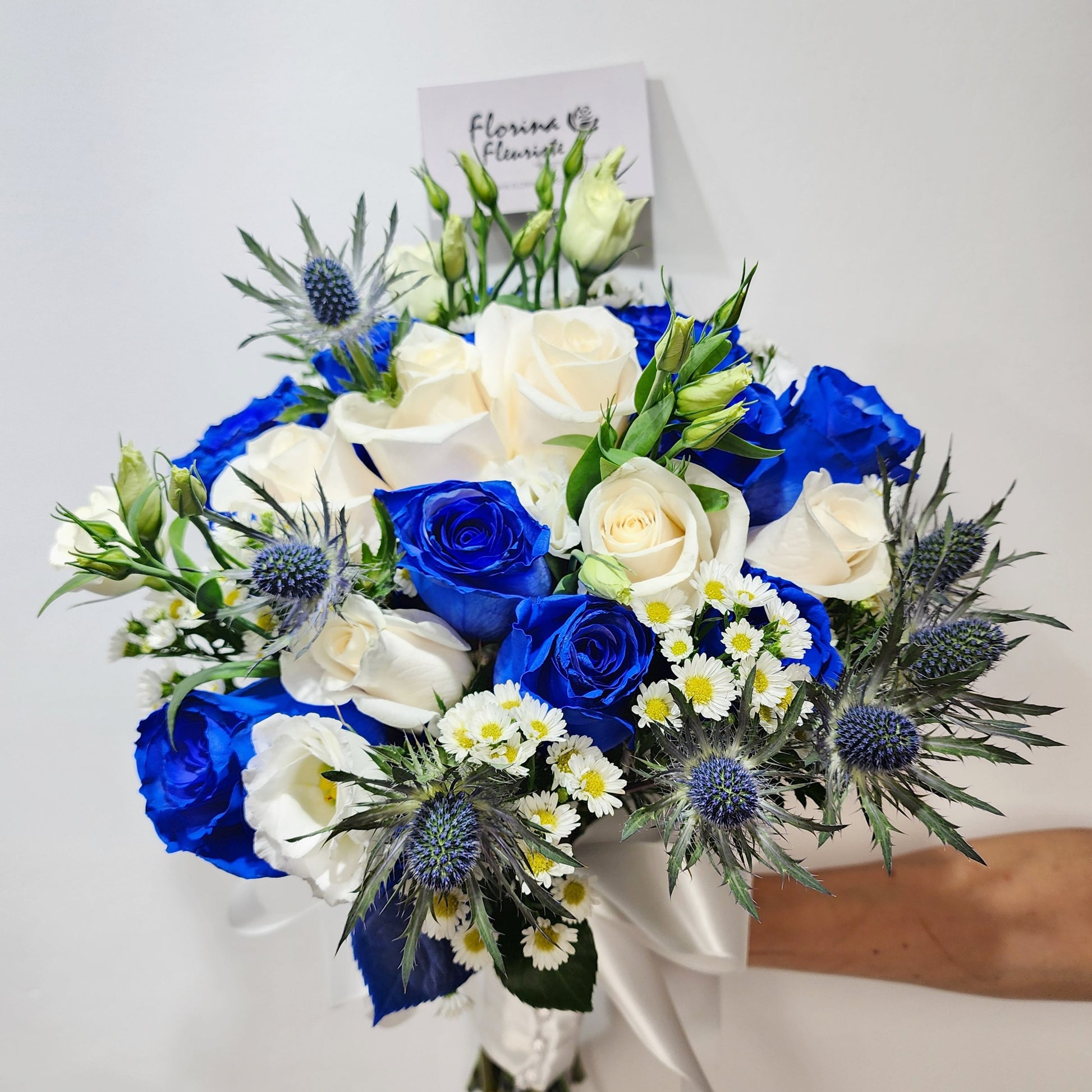 Roses bleues, roses blanches, Lisianthus, Chardon.