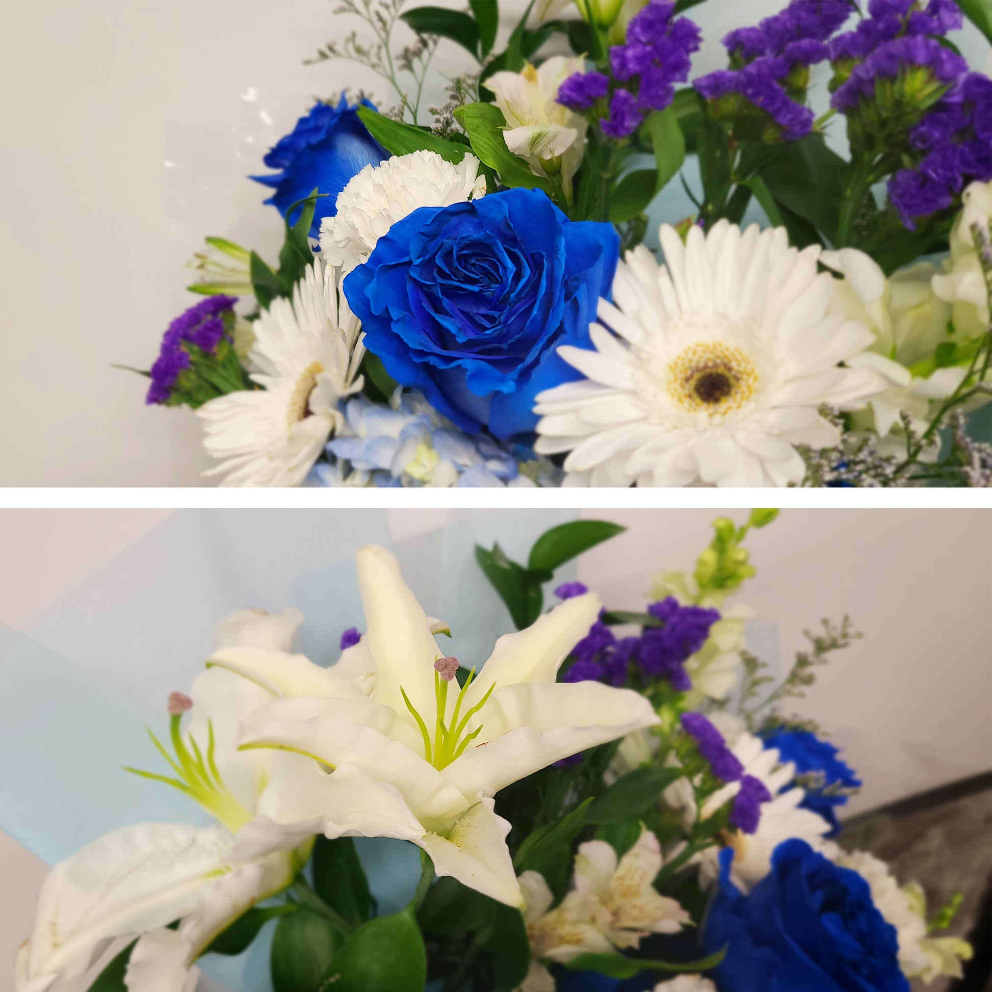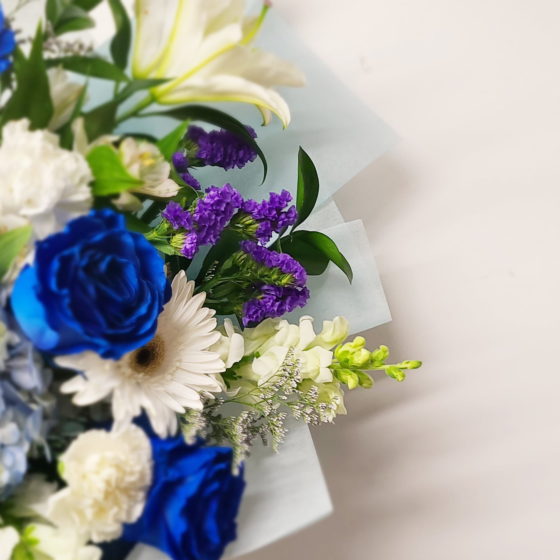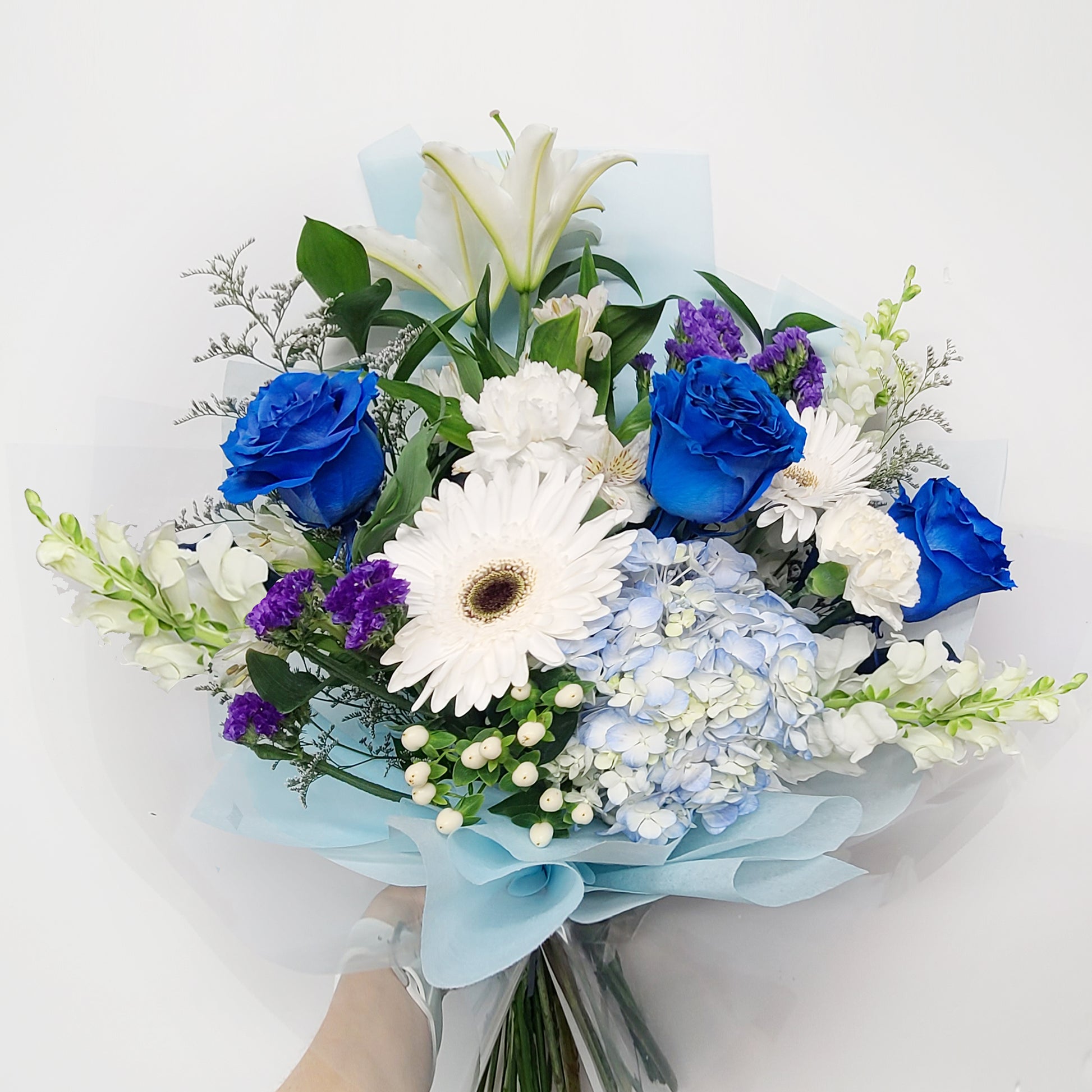 Roses bleues, lys, hortensia, muflier, gerbera, œillets, corraline et feuillage.