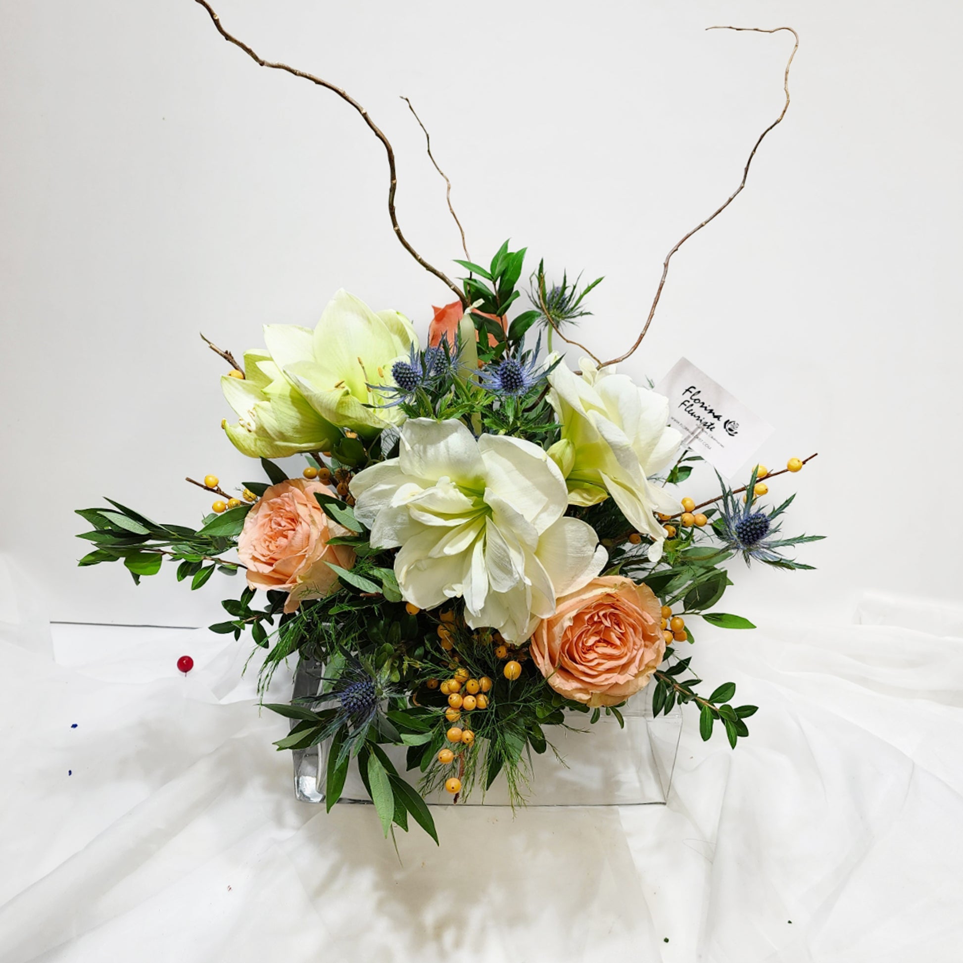 4 Peach Rose , lily , Hypericum , Corraline and foliage. Eringium with vase.