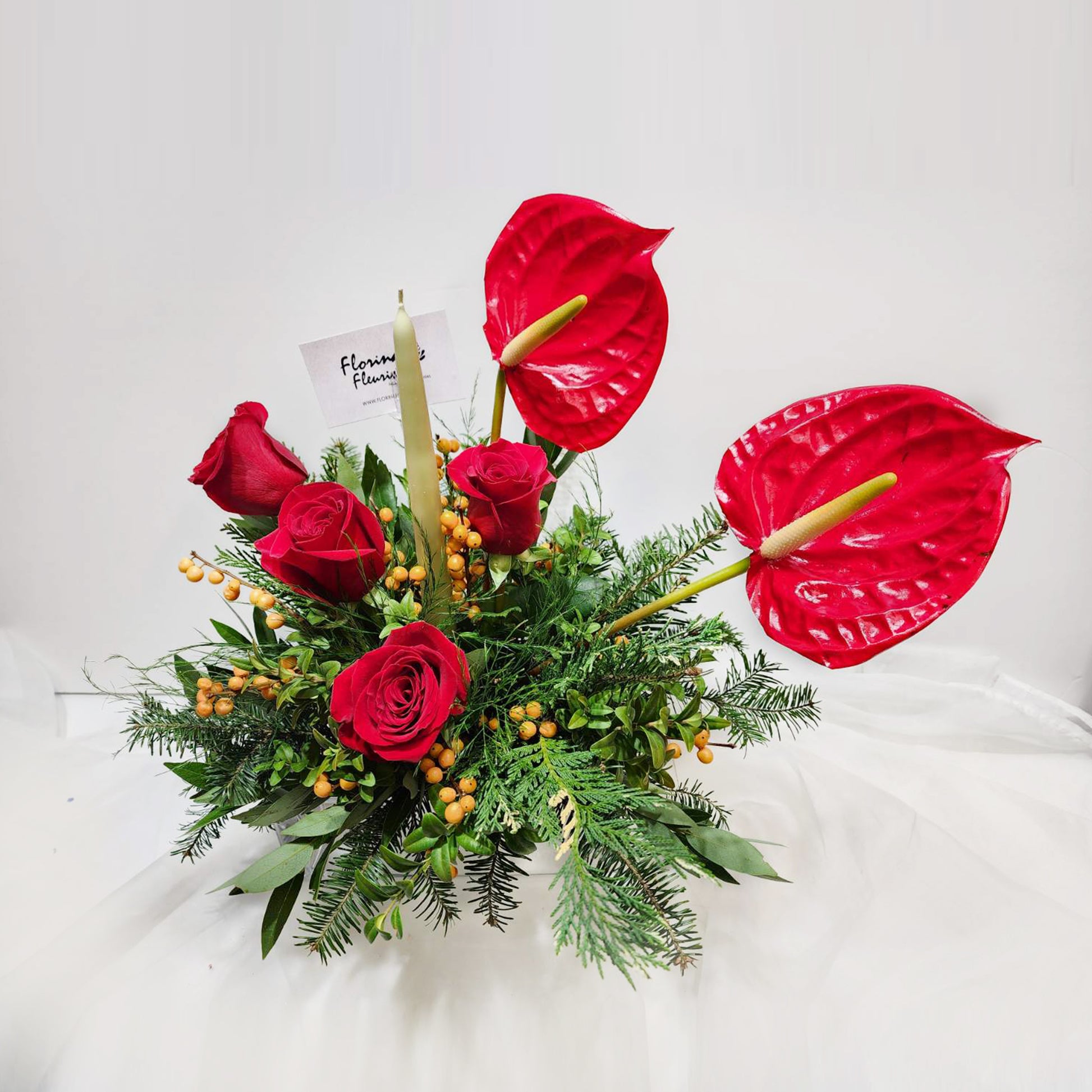 4 Red Rose , Hypericum , Corraline and foliage. candle with vase.