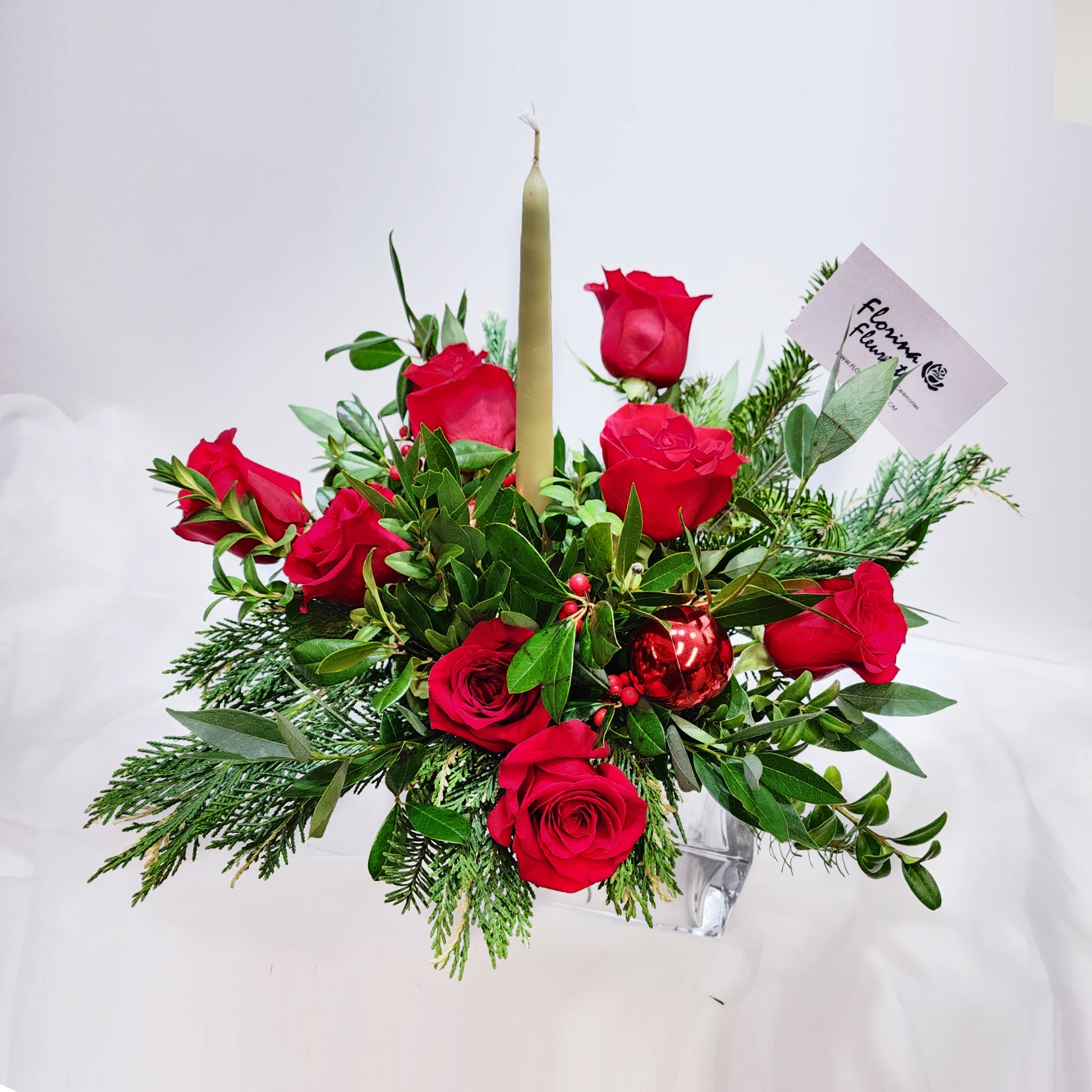 8 Rose Rouge, Hypericum, Corraline et feuillage. bougie avec vase.