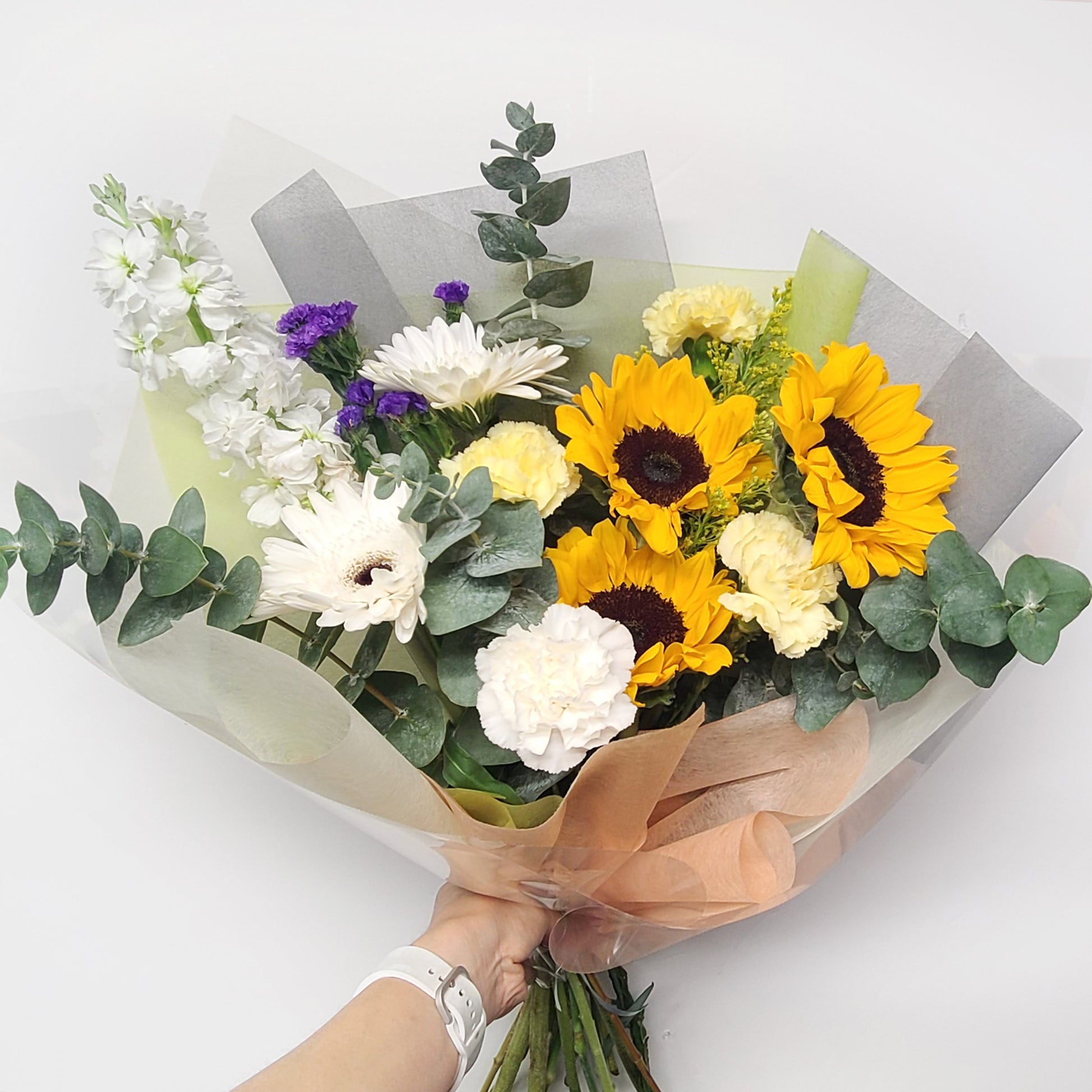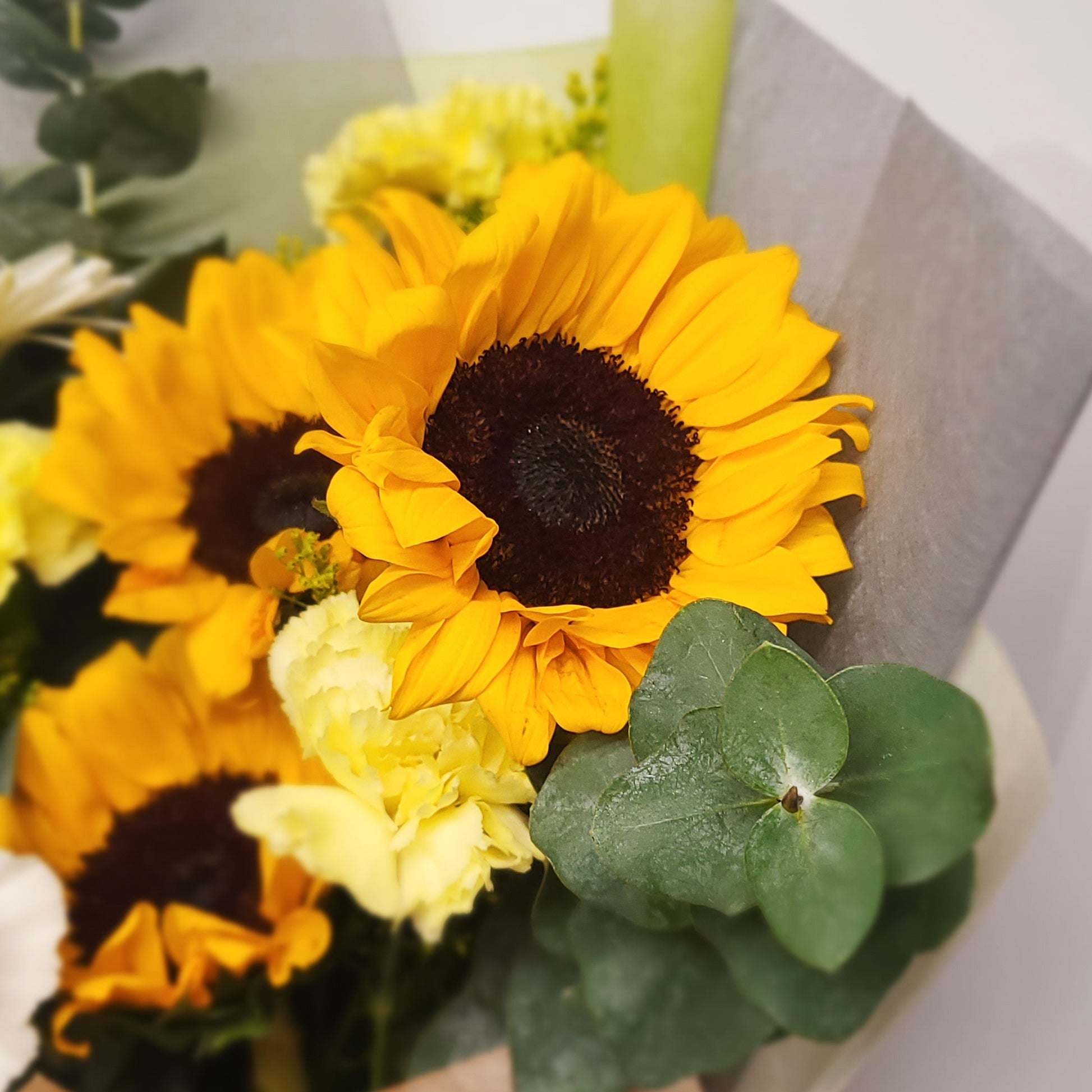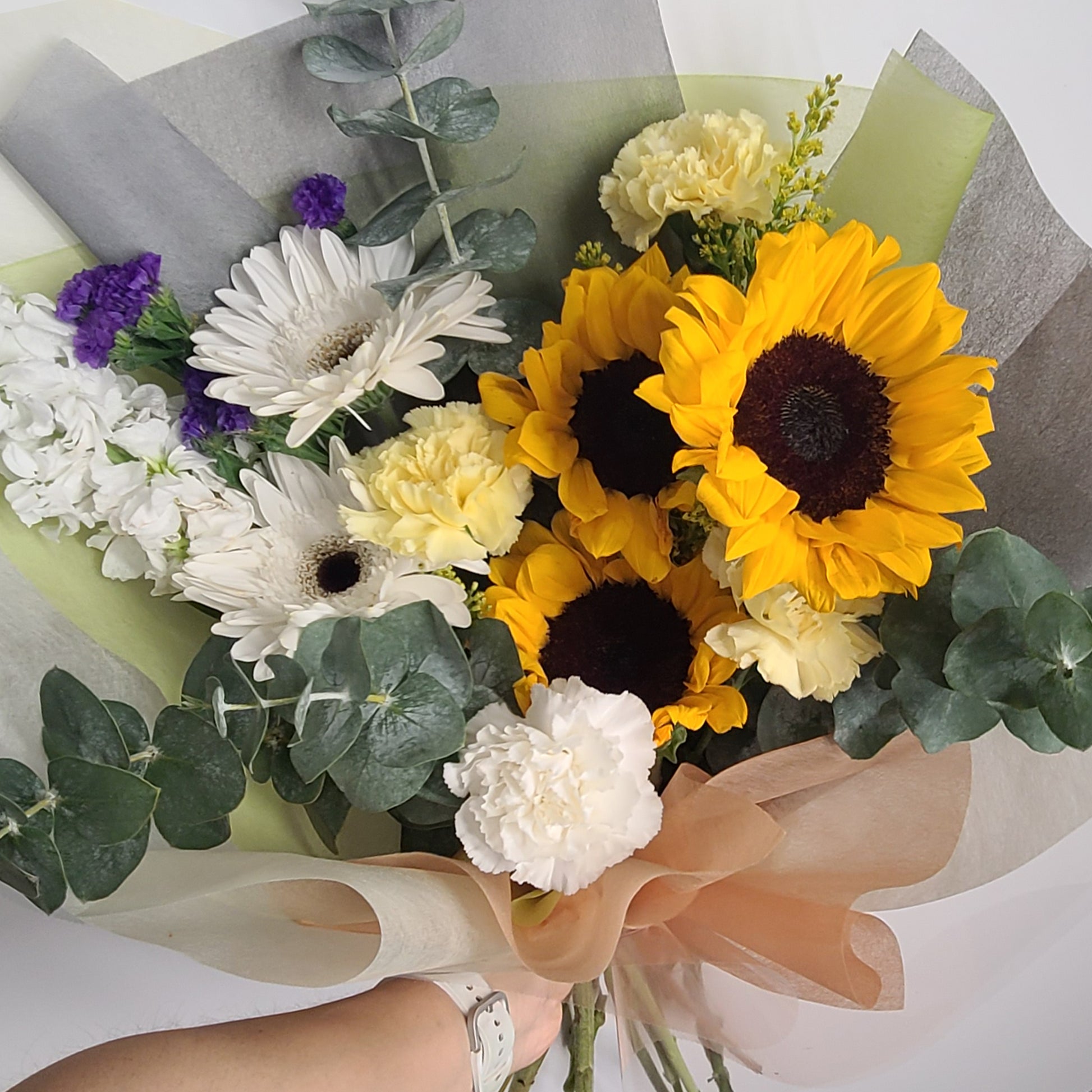 Sun flower , Gerbera , Carnations and Eucalyptus.