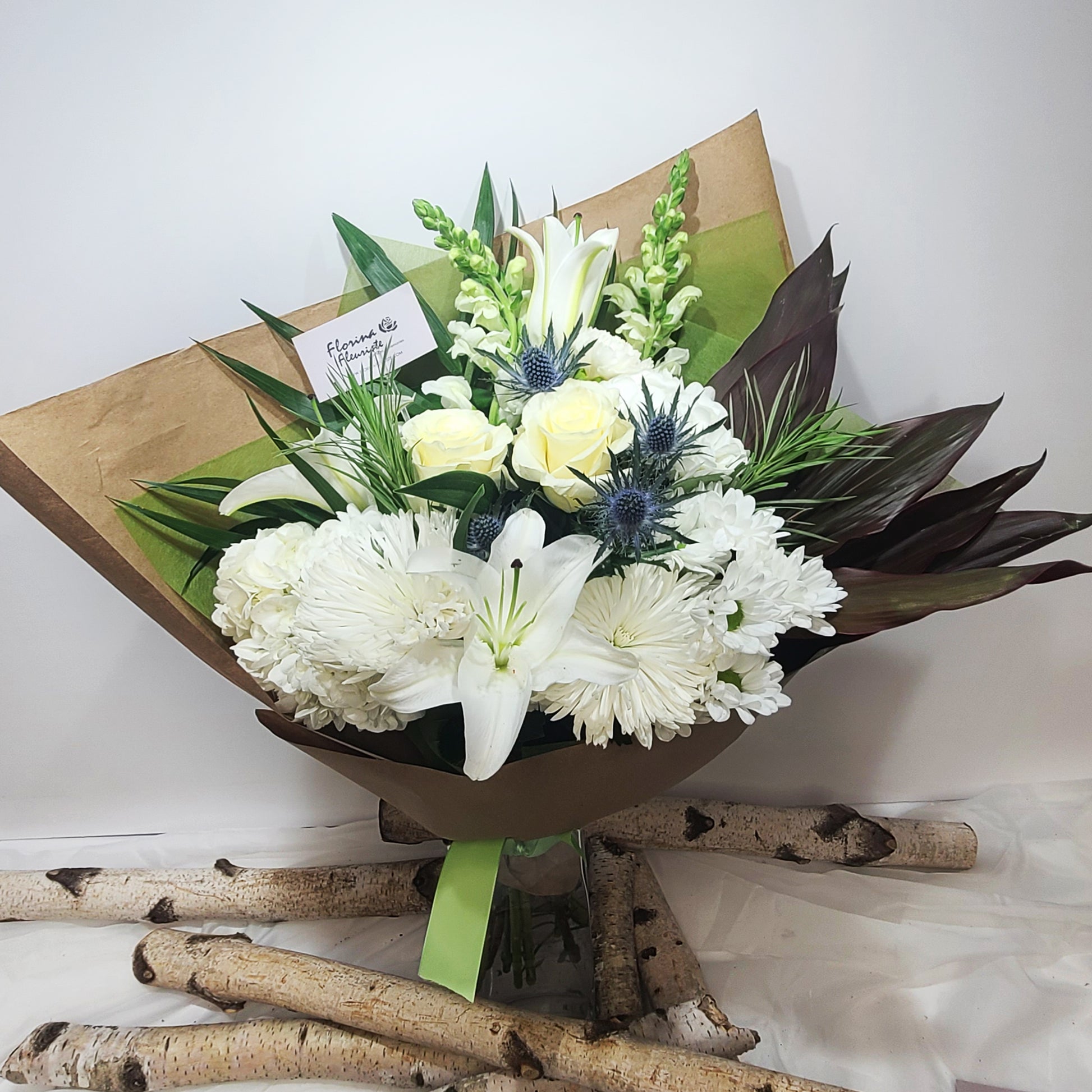 2 Rose blanche, lys, hortensia, Muflier, Marguerite, Corraline et feuillage.