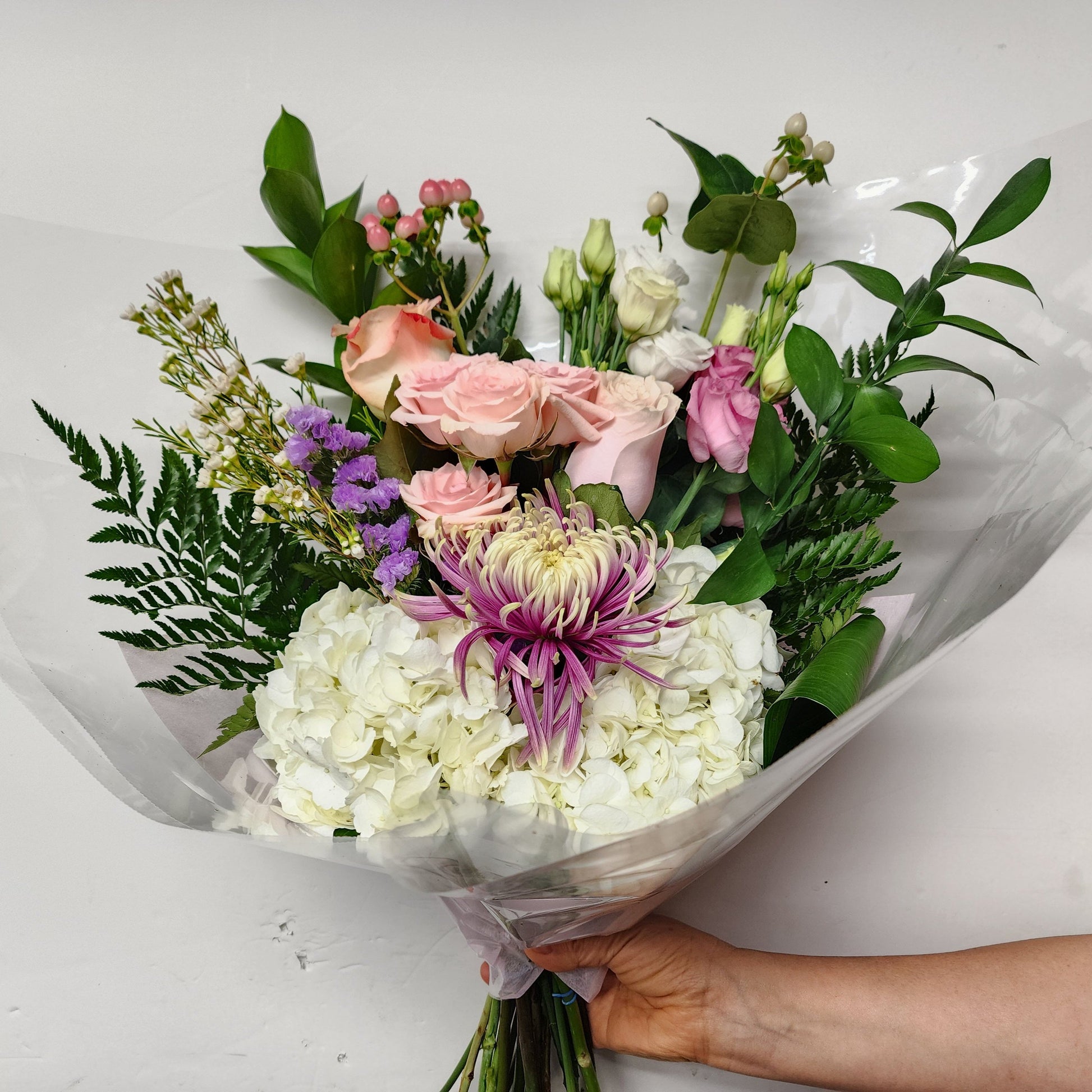 Hydrangea, Roses, Spray roses, Lisianthus, Chrysanthemum, Hypericum berries, Wax flowers, Statice, Ruscus, Leather leaves, Aspidistra