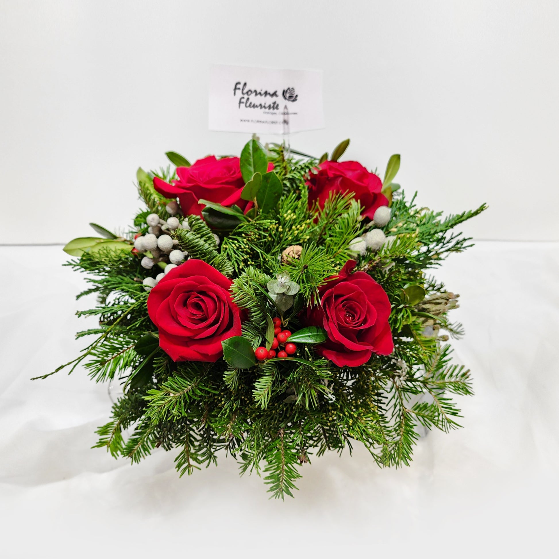 4 Red Rose , Hypericum , Corraline and foliage. candle with vase.